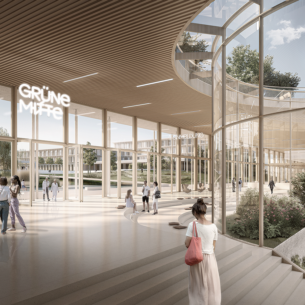 Zwecks guter Orientierung, kurzer Wegeführungen und der Entflechtung der Zugänge für verschiedene Nutzergruppen ist als Rückgrat einer effizienten Organisation ein kreuzförmiges Erschließungssystem vorgesehen. Parallel zur städtischen Kante des historischen Gebäudes nimmt eine Transversale den Haupteingang auf. Daran angelagert sind Apotheke, Buffet sowie der Andachtsraum. Eine Magistrale in der Mittelachse erschließt, von der Halle im Kreuzungspunkt mit der Transversale ausgehend, auf fünf Ebenen die Klinikbereiche und Bettenstationen. Die fingerförmige Ausbildung der Stationen gewährt ungehindert Ausblick in die begrünten Freiräume und den Grüngürtel.