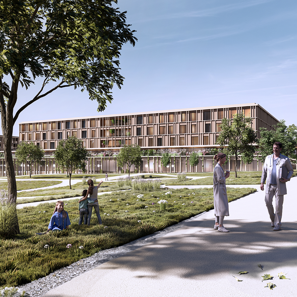 Die Neustrukturierung und Erweiterung orientiert sich an den Höhen des historischen Spitalsgebäudes sowie des bestehenden Pflegeheims und zielt auf ein harmonisches Gefüge von Alt und Neu ab. Zur Verkehrsberuhigung und als grüner Filter wird anstelle der derzeitigen Zufahrtsstraße zwischen dem Parkdeck und der Spitalsanlage eine autofreie Promenade angelegt, die zusammen mit begrünten Pausenhöfen, Atrien, Terrassen und Gründächern ein Freiraumnetz mit hoher Aufenthaltsqualität bildet.