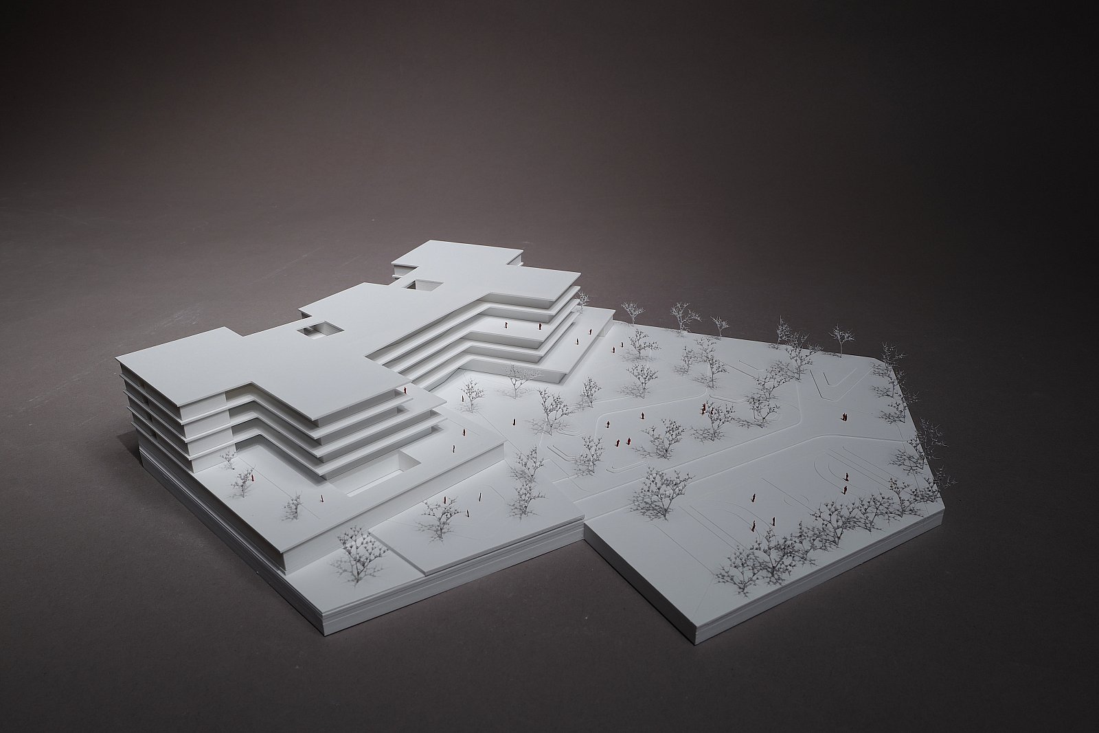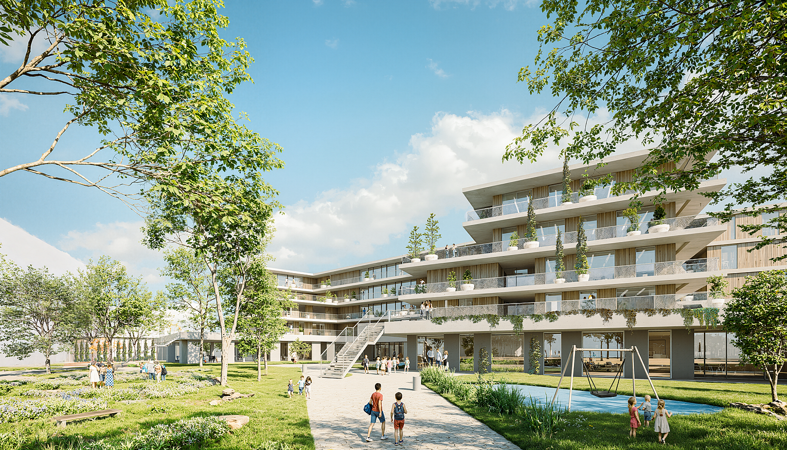 Die Freiraumgestaltung gliedert sich in einen öffentlichen Eingangsbereich, eine exklusive Zone für Unterricht, Spiel und Rückzug sowie einen offenen Garten mit Spielwiese und naturnahen Elementen. Dachterrassen werden als begrünte Outdoor-Klassenzimmer genutzt. Ein „Ökopark“ mit klimaresilienten Bäumen und ökologischen Nischen fördert Biodiversität und Umweltbewusstsein. Das Energiekonzept basiert auf einer hoch effizienten Gebäudehülle, Photovoltaikanlagen, Geothermie und Wärmepumpen, ergänzt durch intelligente Lüftungs- und Speichertechnik. Ein durchdachtes Brandschutz- und Evakuierungskonzept mit klaren Brandabschnitten, horizontaler Entfluchtung und barrierefreien Evakuierungsaufzügen gewährleistet Sicherheit für alle Nutzer:innen.