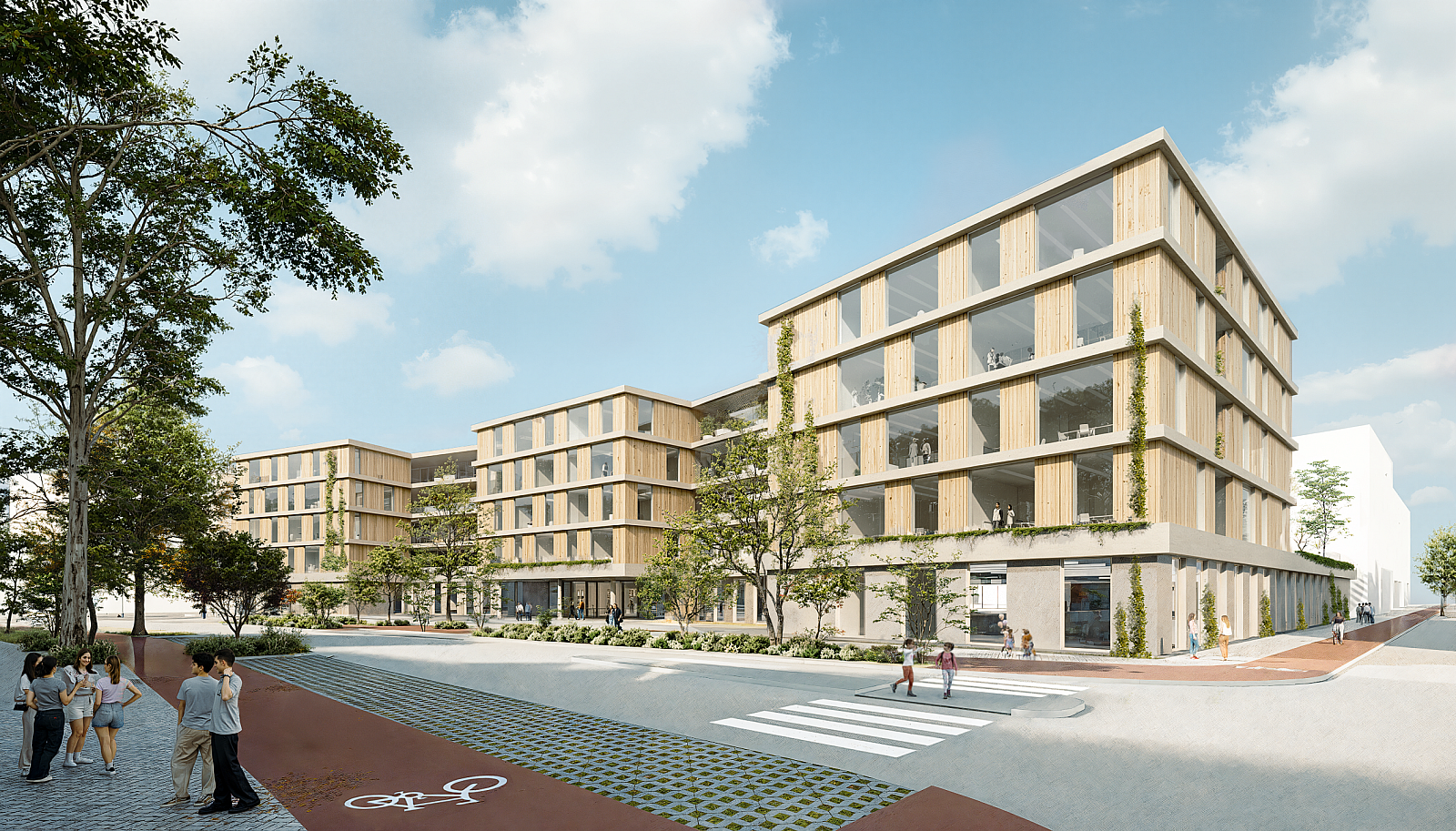 Im Inneren steht eine klare und effiziente Wegeführung im Vordergrund. Eine großzügige Eingangshalle mit Blick in den Schulhof führt in den Veranstaltungssaal, zwei Haupttreppenhäuser sowie zusätzliche Kerntreppen sichern die vertikale Erschließung. Pro Geschoss sind zwei Bildungsbereiche mit gemeinsamen Funktionen und Kommunikationsflächen organisiert, wodurch kurze Wege und Übersichtlichkeit entstehen. Das Tragwerk in Holz-Stahlbeton-Hybridbauweise verbindet Robustheit, Langlebigkeit und ökologische Ansprüche, ergänzt durch modulare Fassadenelemente aus Holzrahmenbauweise und vorgefertigte Bauteile.