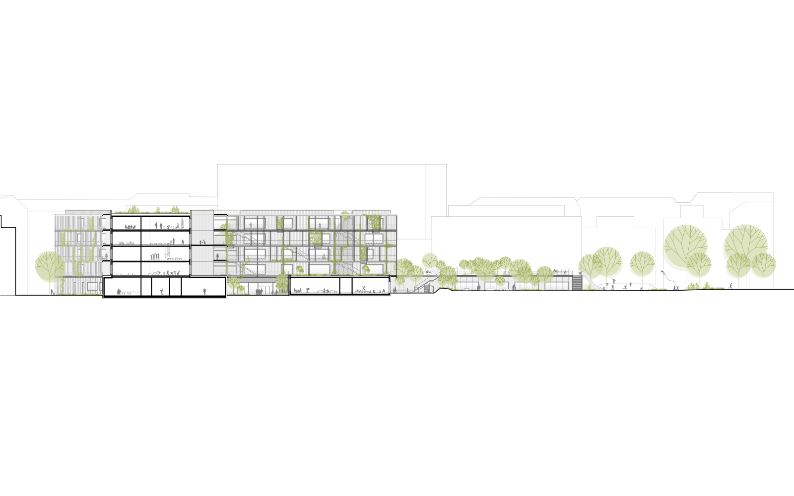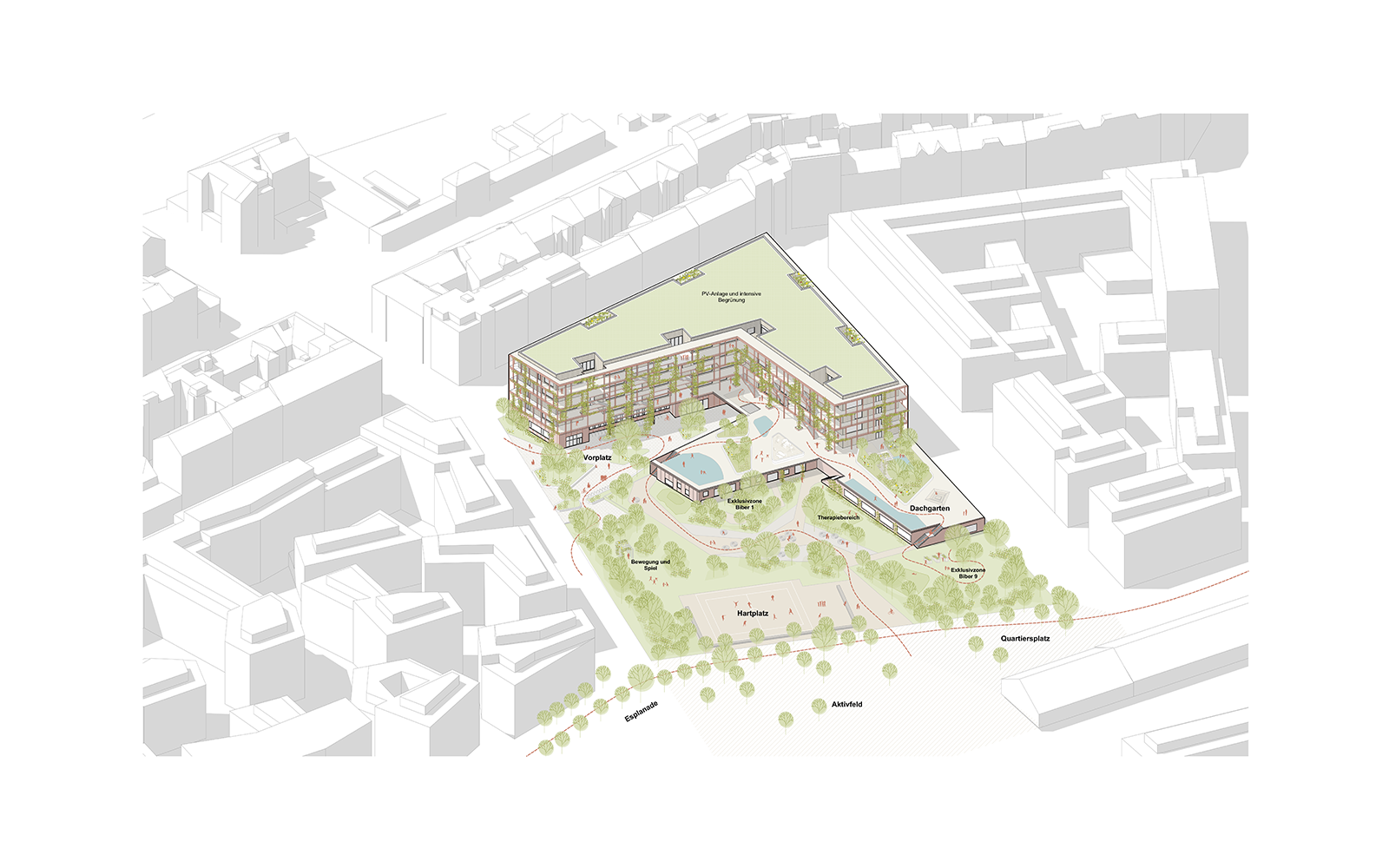 Das L-förmige Hauptgebäude schließt zur Straße hin den Blockrand und öffnet sich gleichzeitig zur begrünten Mitte des Quartiers. Von außen prägt das Gebäude eine umlaufende, zwei bis sieben Meter tiefe Ereigniszone, welche den Nutzer:innen ein vielfältiges Angebot an Freiflächen bietet. Eine „grüne Hülle“ mit Kletterpflanzen und Pflanztrögen beschattet die Fassaden im Sommer, verbessert das Stadtklima und bietet Schülerinnen, Schülern und Lehrenden vielfältige Freiräume unmittelbar am Gebäude.