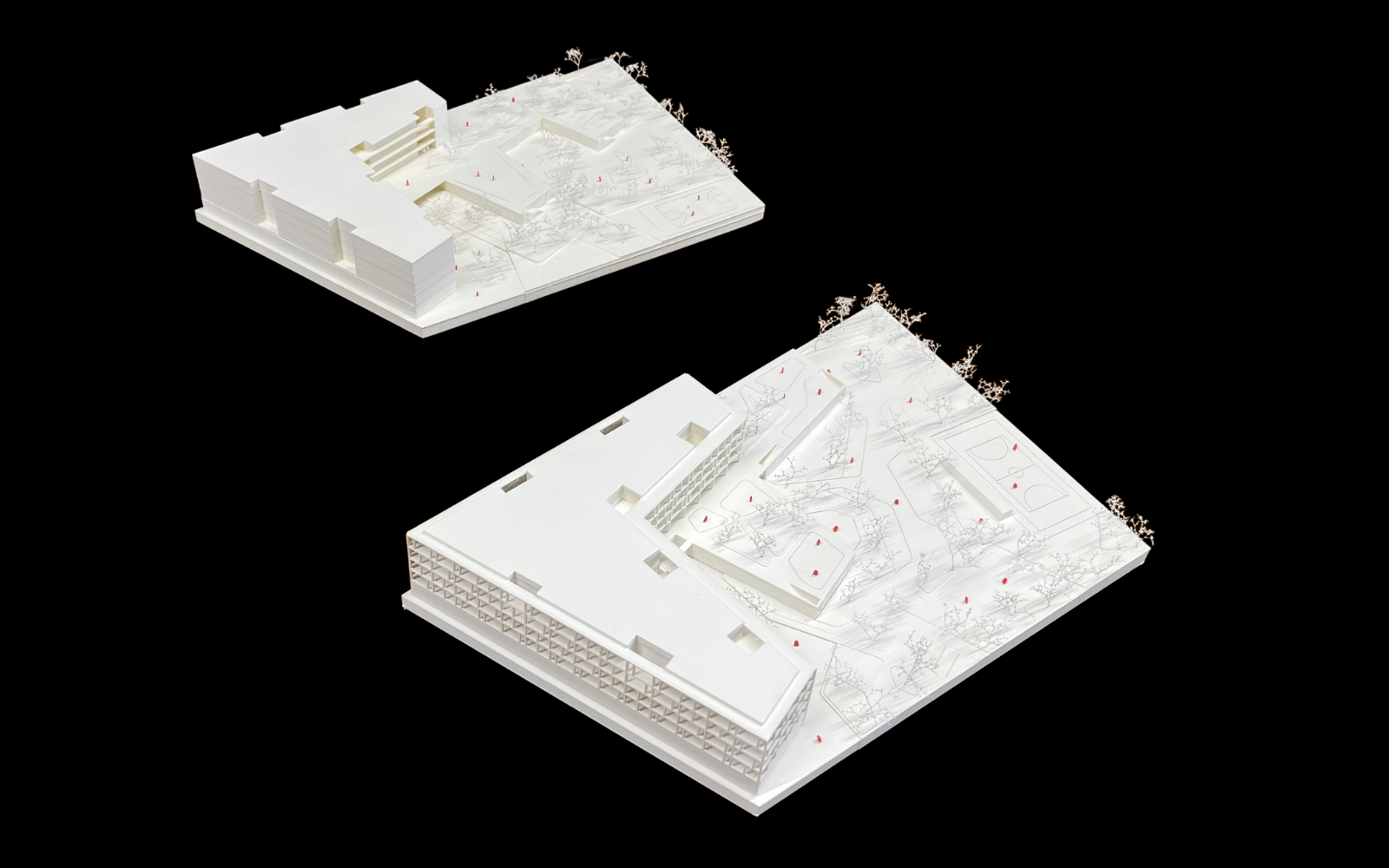 Im Inneren verbindet ein zentraler Boulevard alle Bereiche: Aula, Turnsaal, Kreativräume und Klassentrakte liegen entlang dieser gemeinsamen Mitte, die durch Lufträume und Sichtverbindungen Offenheit und Gemeinschaft fördert. Trotz der Größe des Campus wirken die einzelnen Bildungsbereiche überschaubar und verfügen jeweils über eigene Außenflächen.