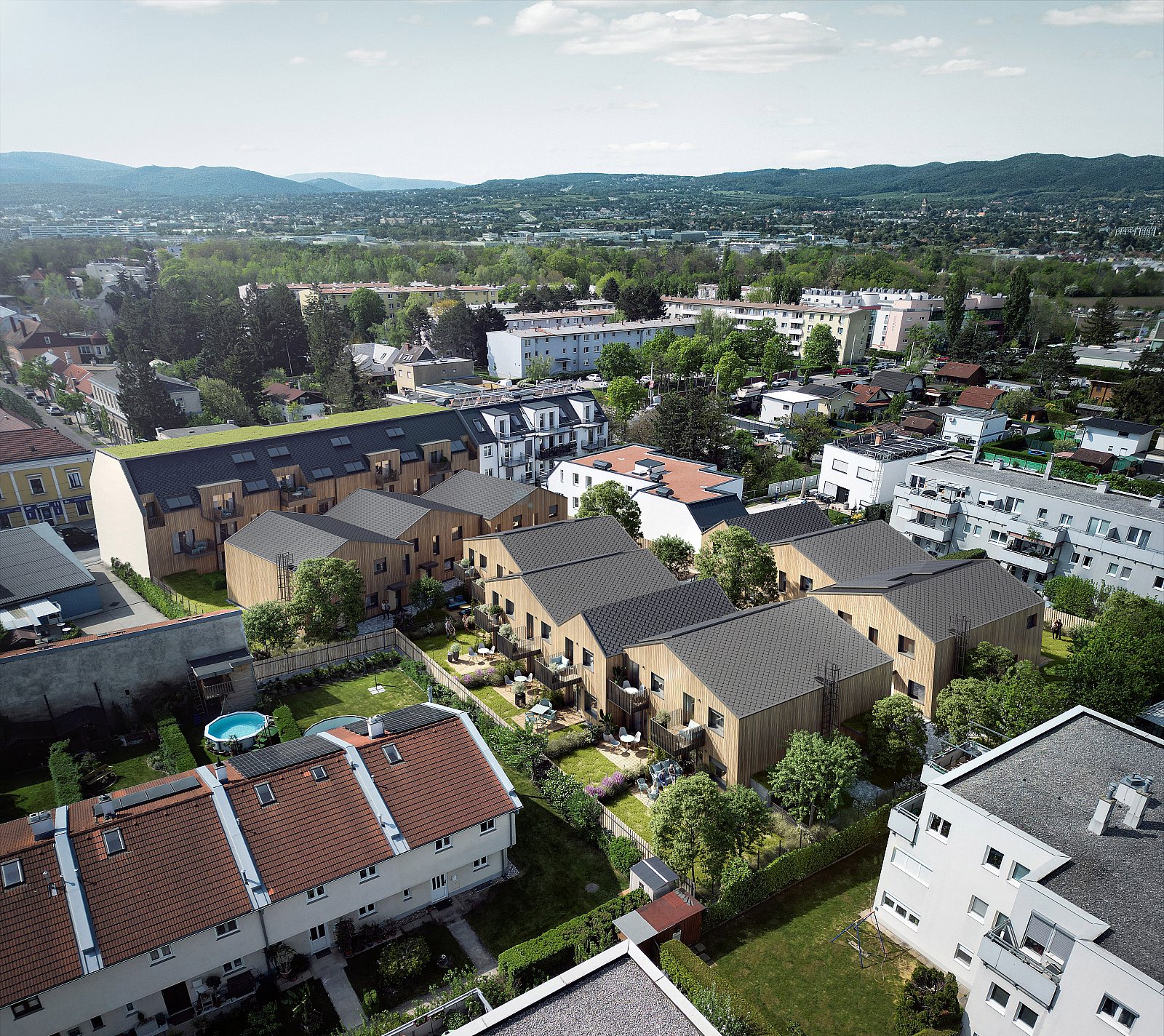 Alle Wohnungen und Reihenhäuser verfügen über private Außenbereiche – Balkone, Loggien, Terrassen oder Eigengärten. Das Projekt wird in Holzbauweise als Passivhaus errichtet, Photovoltaik auf den Dächern und eine Luft-Wärmepumpe sorgen für eine klimaeffiziente Energieversorgung.